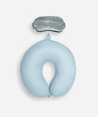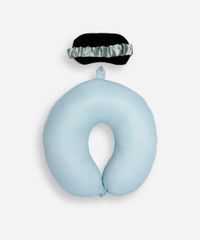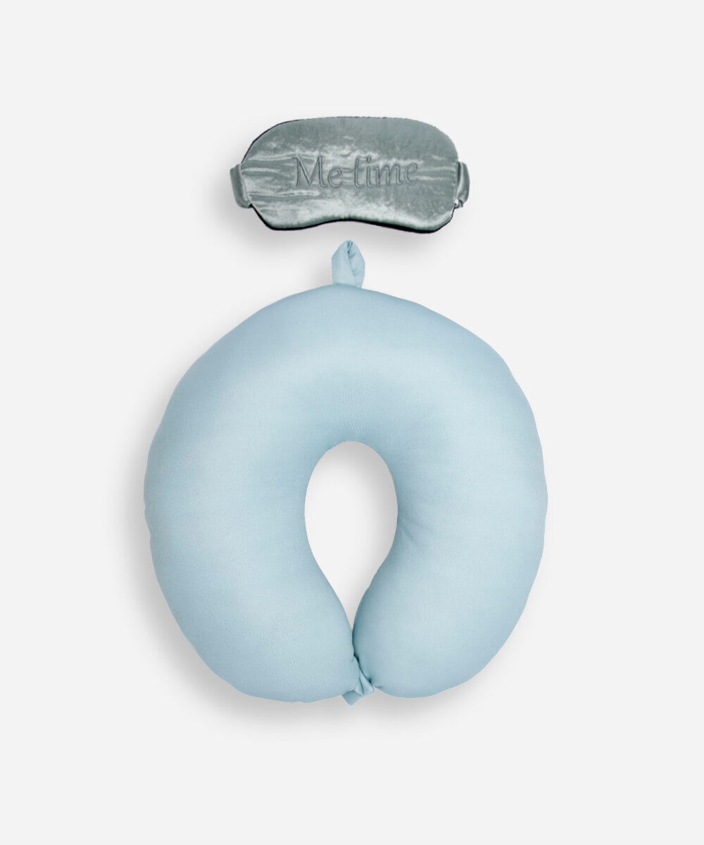 Apoio de pescoço confeccionado em malha com toque macio. O modelo tem formato de redondo, com enchimento interno e fechamento por botão de pressão Acompanha máscara para dormir com bordado escrito "Me time".