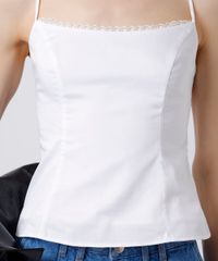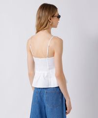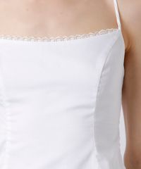 Bata feminina confeccionada em tecido plano de algodão. A peça tem modelagem levemente ajustada ao corpo, com recortes verticais e barras amplas. O modelo tem decote quadrado com renda aplicada, alças finas ajustáveis e lastex aplicado na parte posterior. Detalhe de acabamento pespontado na barra.
