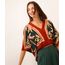 Blusa feminina confeccionada em malha de viscose com toque leve. A peça possui modelagem bata com caimento solto, mangas curtas e amplas, decote V frontal e detalhe de recorte posterior, estampa de folhagem com cores contrastantes, elástico embutido na barra e acabamento pespontado.