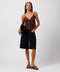 Bata feminina confeccionada em tecido plano texturizado. A peça tem modelagem aicnturada com recorte formando franzidos e caimento solto ao corpo. O modelo tem decote V, e alças finas ajustáveis. Possui forro em malha e acabamento com renda floral aplicada na barra.