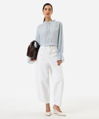 • Mangas longas com elástico nos punhos, que criam um efeito sutilmente volumoso.