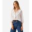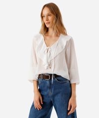 Bata feminina confeccionado em tecido plano texturizado. A peça tem modelagem reta e caimento solto ao corpo. O modelo tem decote em V com tiras finas para amarração, babado aplicado e mangas longas com elástico nos punhos. Detalhe de acabamento pespontado na barra. Não possui forro.