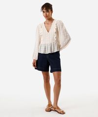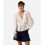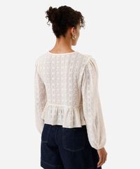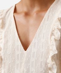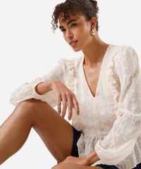 Bata feminina confeccionada em tecido plano texturizado. A peça tem a modelagem e construção reta, caimento solto ao corpo com recorte inferior. O modelo tem decote V, babados aplicado e mangas longas com elástico embutido nos punhos.