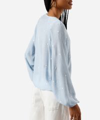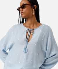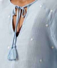 Bata feminina confeccionado em tecido plano com viscose e bordados poá. A peça tem modelagem reta e caimento solto ao corpo. O modelo tem decote em V com tiras finas para amarração e mangas longas bufantes com elástico nos punhos. Detalhe de acabamento pespontado na barra.