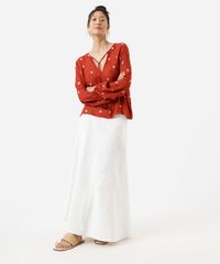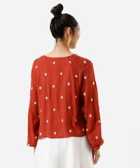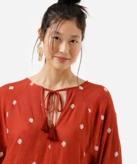 Bata feminina confeccionado em tecido plano texturizado com viscose e bordados geométricos. A peça tem modelagem reta e caimento solto ao corpo. O modelo tem decote em V com tiras finas com tassel para amarração e mangas longas bufantes com elástico nos punhos. Detalhe de acabamento pespontado na barra.