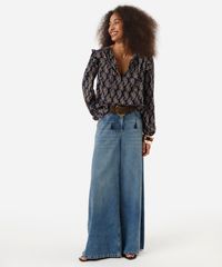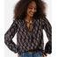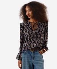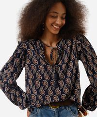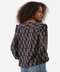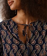 Bata feminina confeccionada em tecido plano de viscose com estampa paisley. A peça tem a modelagem e construção reta e o caimento é solto ao corpo. O modelo tem decote redondo, fechamento por tiras finas de amarração com tassel nas postas e mangas longas com elástico embutido nos punhos e babados nos ombros. Detalhe de acabamento pespontado na barra.