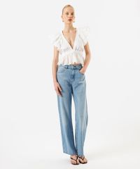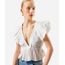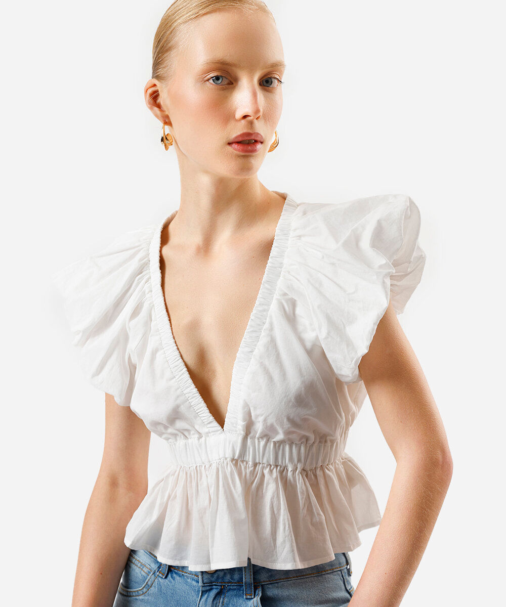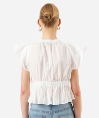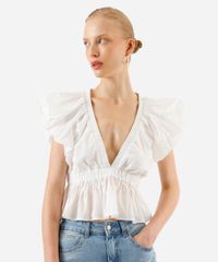 Blusa feminina confeccionada em malha de algodão texturizada com toque leve. A peça possui modelagem bata com caimento levemente solto no corpo, decote V, mangas curtas estilo balonê, elásticos embutidos auxiliando no desenho da silhueta, detalhes de babados e recortes, acabamento pespontado.