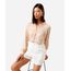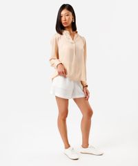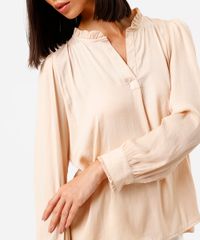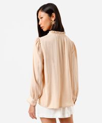 Bata feminina confeccionada em tecido plano com toque levemente acetinado. A peça possui modelagem reta, caimento solto e fluido, decote V decorado com babado drapeado, mangas longas com abotoamento nos punhos e acabamento pespontado.
