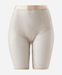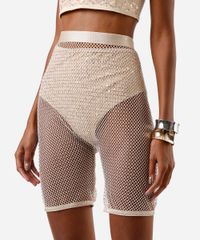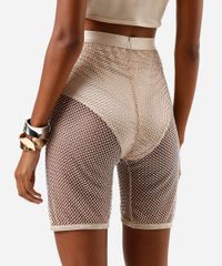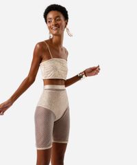Economia de R$ 40,00Bermuda feminina confeccionada em malha telada com aplicação de brilhos. A peça tem a modelagem biker, com construção reta e o caimento é confortavelmente ajustado ao corpo. O modelo tem cintura alta, cós com elástico embutido e acabamento pespontado nas barras.