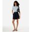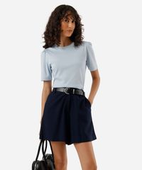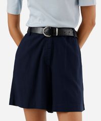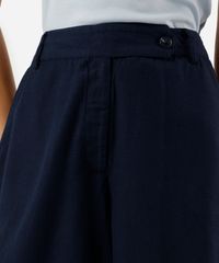 Bermuda de alfaiataria feminina confeccionada em tecido plano com linho. A peça tem modelagem reta e caimento solto ao corpo. O modelo tem cintura alta, cós com passantes para cinto e fechamento por zíper e botão. Possui dois bolsos faca frontais e dois embutidos decorativos com lapelas na parte posterior. O acabamento é pespontado nas barras.