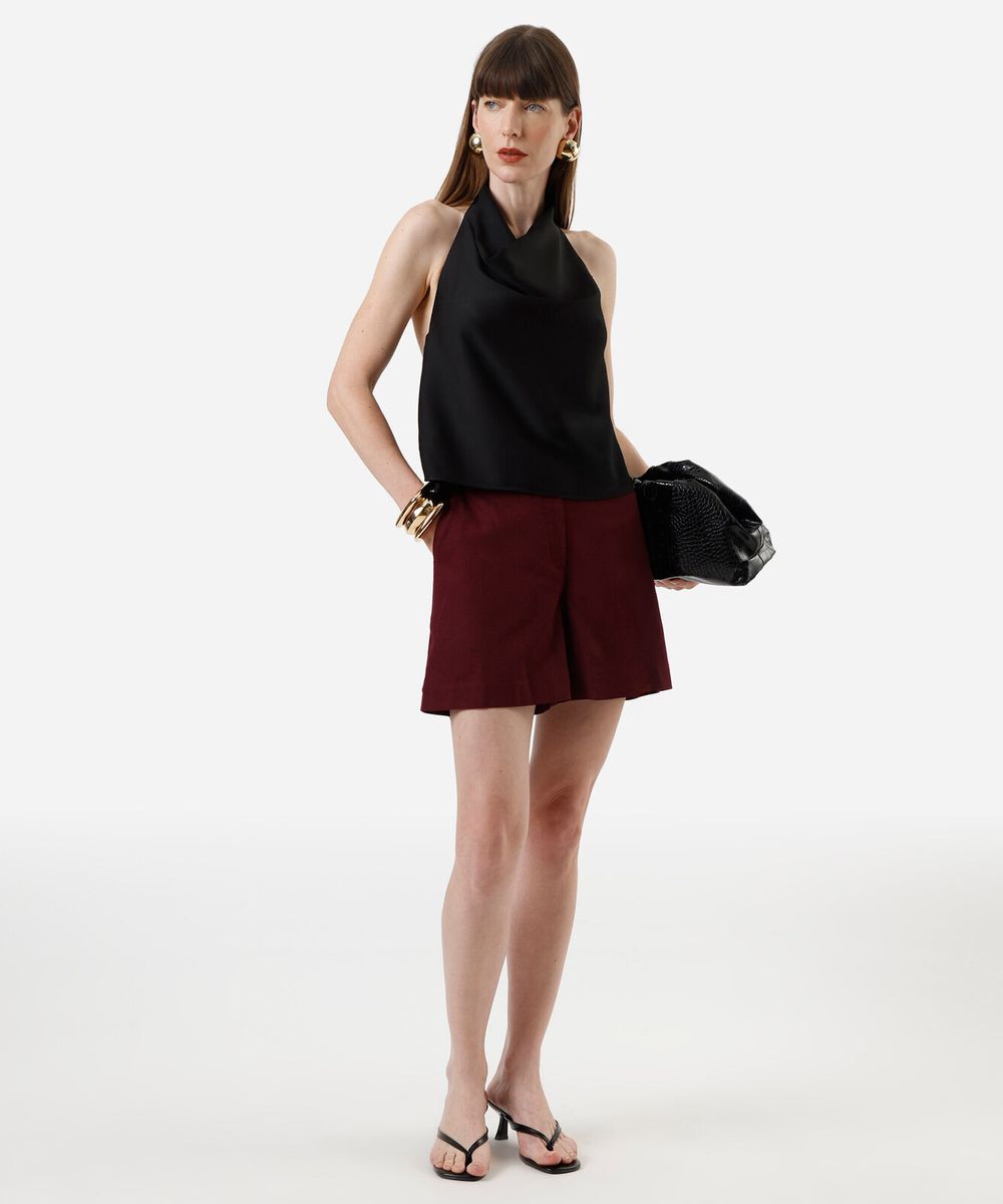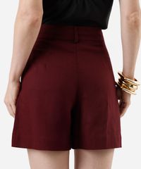 Bermuda de alfaiataria feminina confeccionada em tecido plano de viscose e linho. A peça tem modelagem reta e caimento solto ao corpo. O modelo tem cintura alta, cós com passantes para cinto e fechamento por zíper e botão. Possui dois bolsos frontais e acabamento pespontado nas barras.