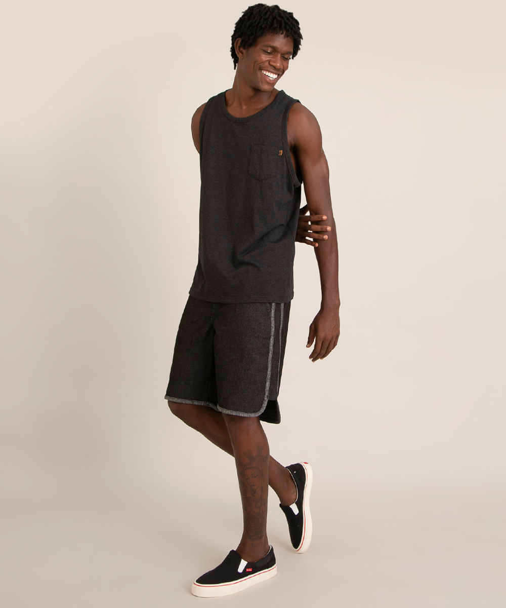 Bermuda masculina confeccionada em sarja com pouca elasticidade. O produto tem modelagem que confere barra levemente arredondada e caimento soltinho. O cós tem design borboleta com amarração frontal por cordão. O modelo conta com dois bolsos frontais tipo faca, um bolso aplicado posterior e acabamento em viés em cor contrastante. O fechamento é por botão e zíper metálicos.