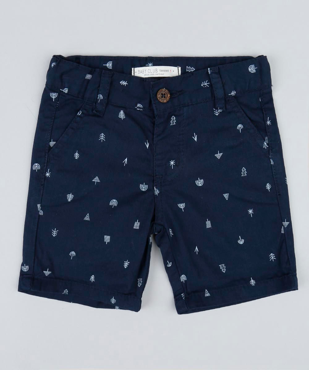 Bermuda infantil masculina confeccionada em sarja leve. Tem mini estampa de árvores variadas. Sua modelagem desce reta do quadril à barra. O modelo conta com dois bolsos frontais e dois posteriores decorativos. O cós é ajustável internamente por elástico e botão. Tem passantes e fechamento por botão.