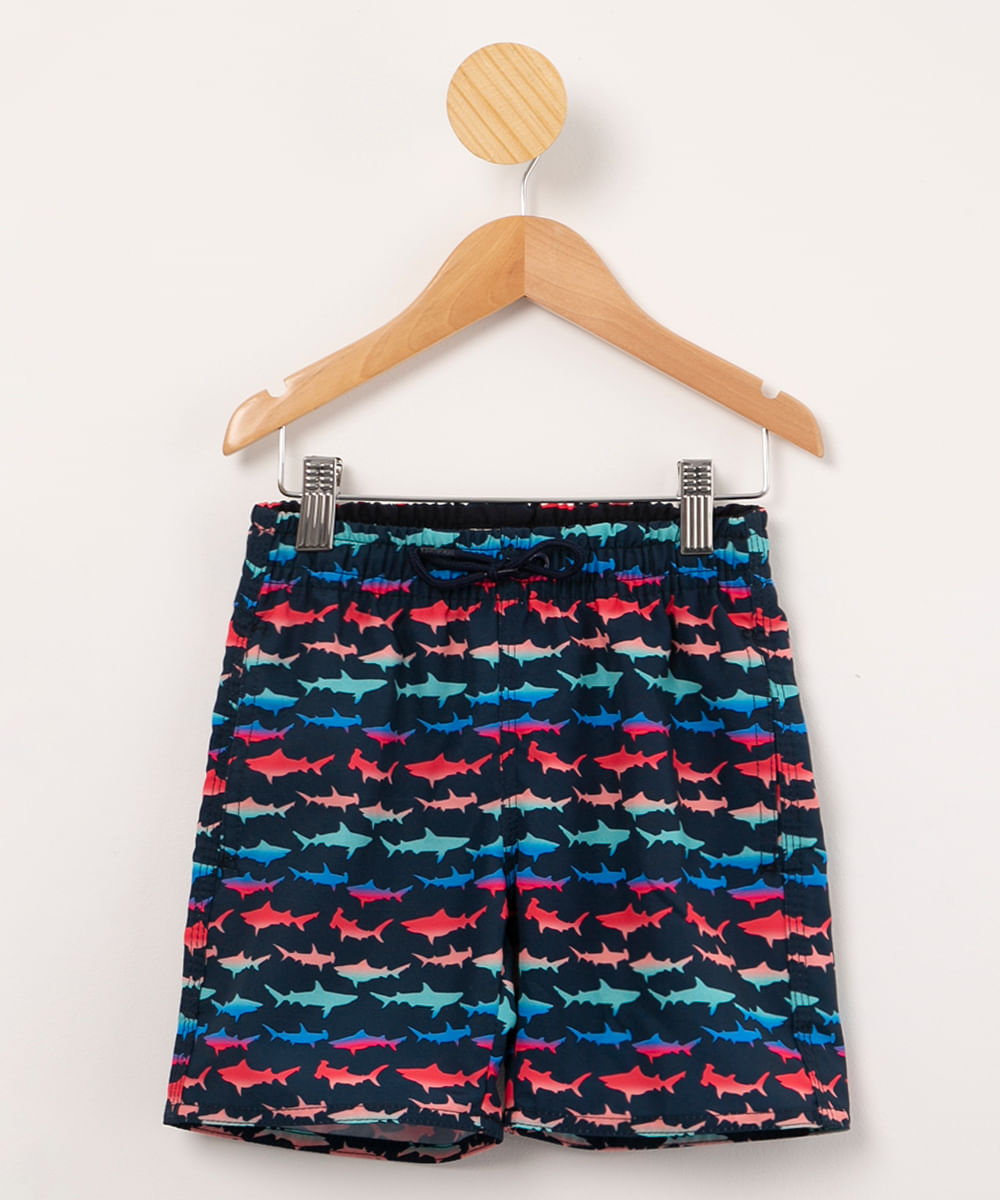 Bermuda de surf infantil confeccionada em tecido plano. O produto tem modelagem reta e elástico embutido no cós com amarração por cordão. Tem dois bolsos frontais embutidos e um bolso aplicado posterior com fechamento por velcro. A peça é estampada de tubarões em cores contrastantes.
