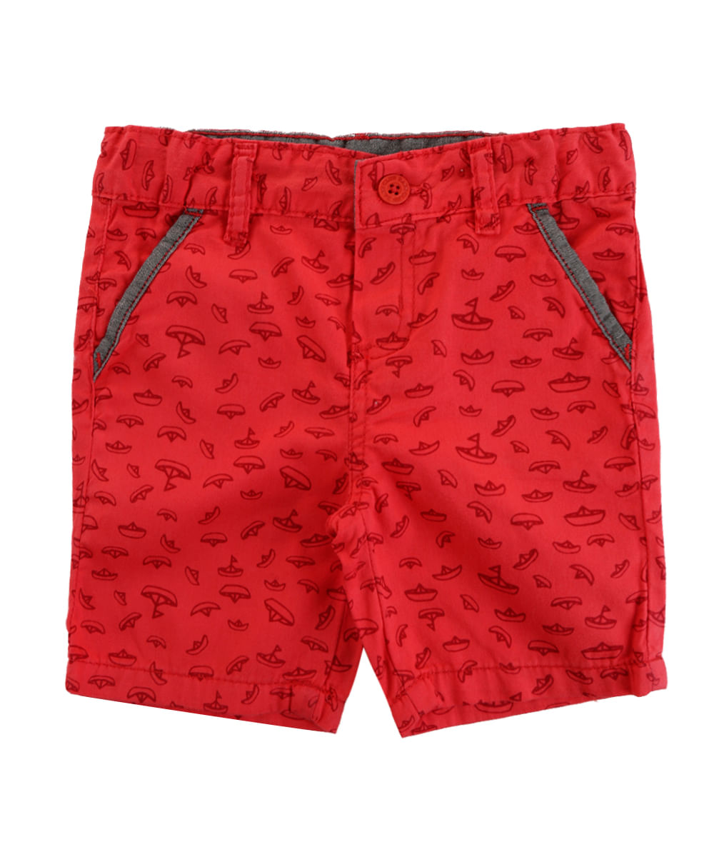Bermuda confeccionada em sarja. O charme do modelo é a padronagem de barcos de papel. A parte frontal tem dois bolsos embutidos enquanto a posterior tem dois decorativos. O cós ajustável tem passantes e o fechamento é por botão e zíper.