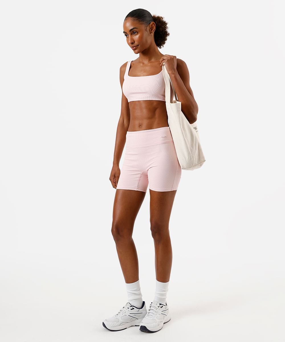 Bermuda feminina confeccionada em malha de poliamida com textura canelada. A peça tem modelagem reta e caimento ajustado ao corpo. O modelo tem cintura alta e cós largo com elástico embutido. Possui acabamento forrado e pespontado nas barras.