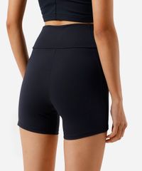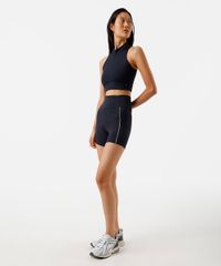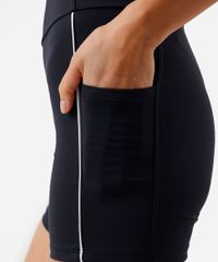 Bermuda feminina confeccionada em malha de poliamida. A peça tem modelagem reta e caimento ajustado ao corpo. O modelo tem cintura alta, cós largo elástico e um bolso aplicado. Detalhe de acabamento com nervuras contrastantes laterais e pesponto nas barras.