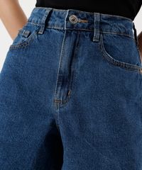 Bermuda feminina confeccionada em jeans. A peça tem modelagem e construção reta e caimento solto ao corpo. O modelo tem cintura alta, cós com passantes para cinto e fechamento por zíper e botão. Possui três bolsos frontais e dois aplicados na parte posterior. Detalhe de acabamento pespontado nas barras.