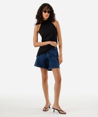 Bermuda feminina confeccionada em jeans. A peça tem a modelagem e construção reta e o caimento é solto ao corpo. O modelo tem cintura alta, cós com passantes para cinto e fechamento frontal por botão e zíper. Possui nervuras e dois bolsos na parte frontal, dois aplicados na parte posterior e acabamento pespontado nas barras.