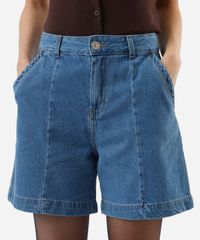 Bermuda feminina confeccionada em jeans. A peça tem modelagem reta e caimento solto ao corpo com recortes frontais. O modelo tem cintura alta, cós com passantes para cinto e fechamento por zíper e botão. Possui dois bolsos frontais, dois aplicados na parte posterior e acabamento em pesponto contrastante.