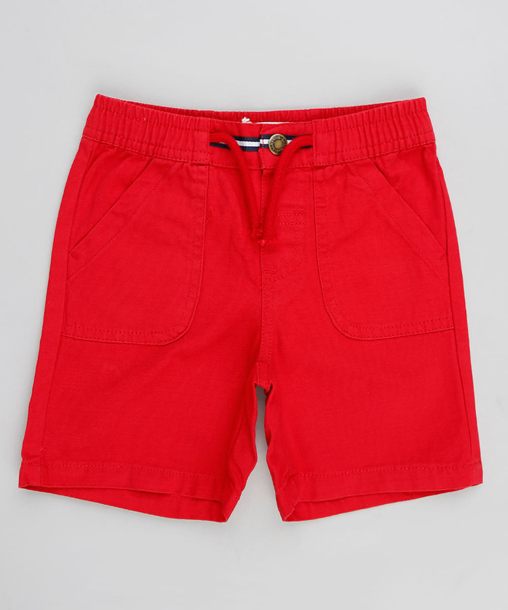 Bermuda infantil desenvolvida em tecido plano. O modelo possui dois bolsinhos frontais e dois posteriores. O cós tem elástico embutido e detalhe de faixa listrada. Tem cordões para amarração. O fechamento é frontal por botões e a barra tem acabamento simples.