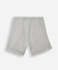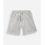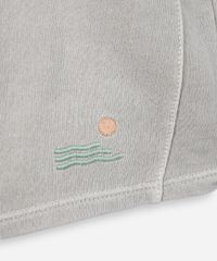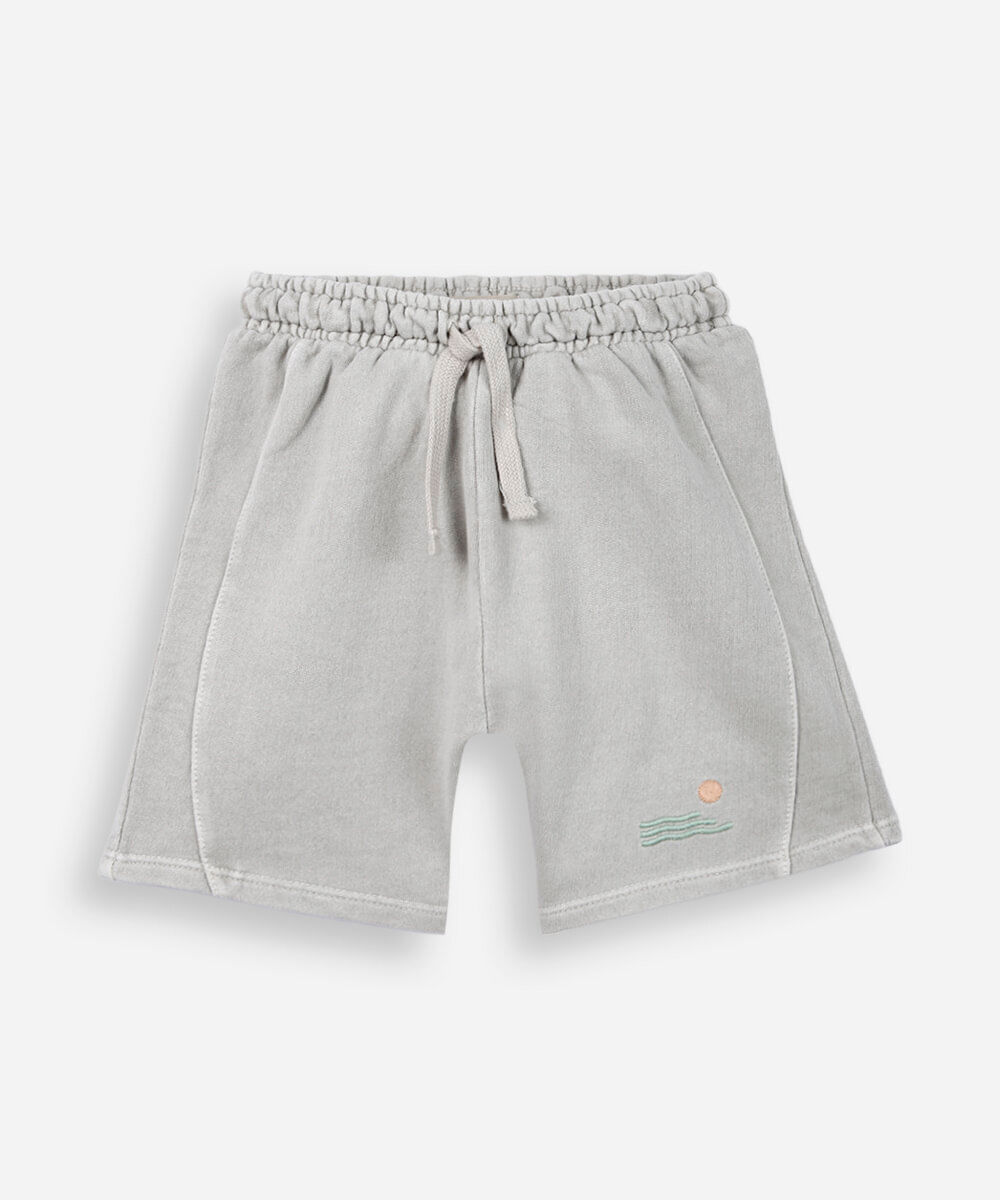 Bermuda infantil confeccionada em algodão com efeito estonado. A peça tem modelagem reta e caimento levemente solto ao corpo. Possui cintura média, cós com elástico embutido proporcionando efeito franzido, cordão para amarração e ajuste, bordado sútil na parte frontal, recortes verticais decorativos e acabamento pespontado.