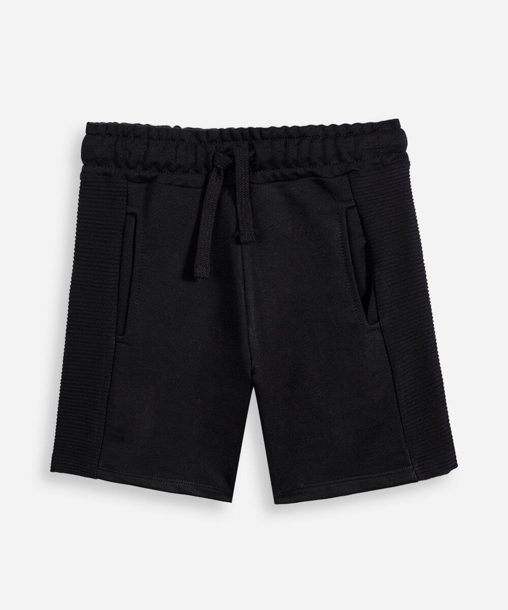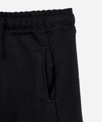 Bermuda infantil confeccionada em moletom. Possui modelagem reta, caimento levemente solto, cintura média, cós com elástico embutido e cordão para amarração e ajuste, detalhes laterais com recortes texturizados na vertical, dois bolsos frontais e acabamento pespontado.