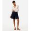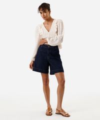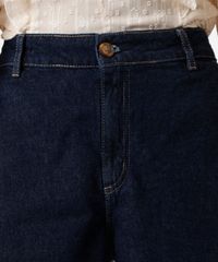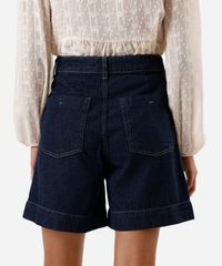 Bermuda feminina confeccionada em jeans de algodão com lavagem escura. A peça tem modelagem reta, caimento levemente solto ao corpo e comprimento médio. Possui cintura alta, cós com passantes aplicados, dois bolsos frontais modelo faca e dois bolsos posteriores, fechamento frontal com botão e zíper. Acabamento pespontado.