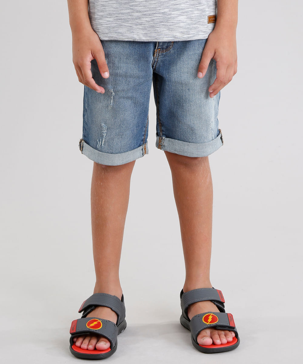 Bermuda infantil masculina desenvolvida em jeans. A modelagem tem caimento reto e detalhe da barra dobrada. O modelo tem dois bolsos na parte frontal e posterior. O cós tem passantes e fechamento por zíper e botão.