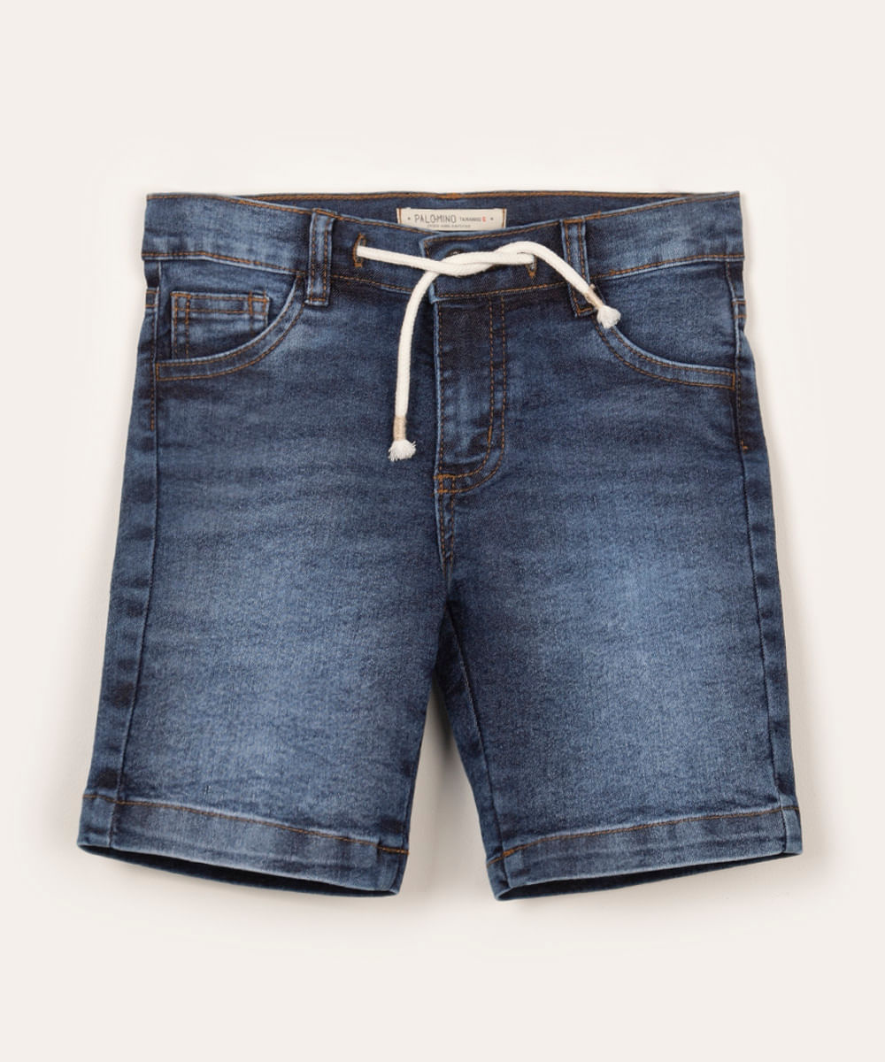 Bermuda infantil confeccionada em jeans com elasticidade. A modelagem é reta com caimento solto e comprimento médio. O modelo tem três bolsos frontais e dois bolsos posteriores aplicados, cós com passantes para cinto e fechamento por zíper e botão metálicos, além de cadarço aplicado para ajuste adicional.