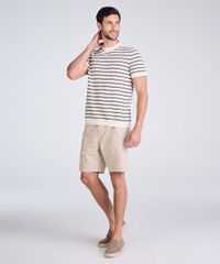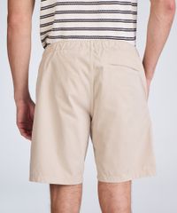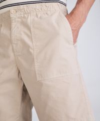 Bermuda masculina confeccionada em sarja. A peça possui modelagem jogger com caimento solto, cintura média, cós com passantes aplicados e elástico embutido, fechamento frontal por botão e zíper, dois bolsos frontais estilo carpinteiro e um bolso posterior estilo chino, acabamento pespontado.