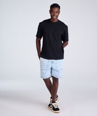 Bermuda masculina confeccionada em jeans. A peça possui modelagem jogger com caimento solto, cintura média, cós com passantes aplicados e elástico embutido, fechamento frontal por botão e zíper, dois bolsos frontais estilo carpinteiro e um bolso posterior estilo chino, acabamento pespontado.