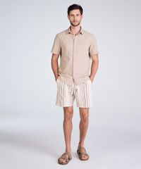 Bermuda masculina confeccionada em malha de algodão com padronagem listrada e toque macio. A peça possui modelagem jogger com caimento solto, cintura média, cós com elástico embutido, dois bolsos frontais estilo faca e dois bolsos posteriores com fechamento por botão, detalhe de recortes, tecido texturizado e acabamento pespontado.