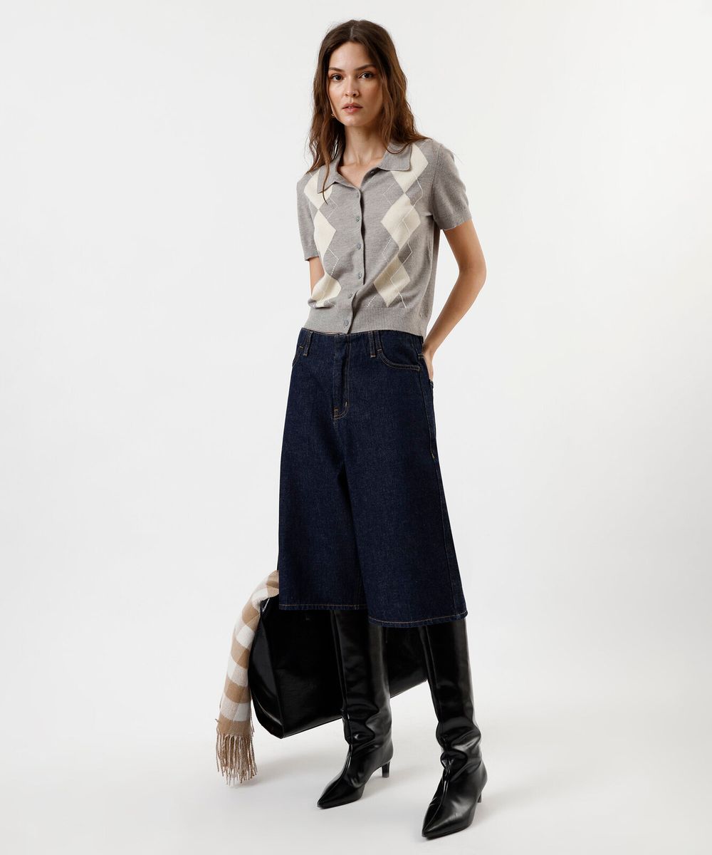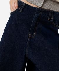 Bermuda feminina confeccionada em jeans. A peça tem modelagem jorts, com construção reta e caimento amplo e solto ao corpo. O modelo tem cintura média, cós sem recorte, passantes para cinto e fechamento por zíper e botão. Possui dois bolsos frontais e dois aplicados na parte posterior. Detalhe de acabamento em pesponto contrastante.