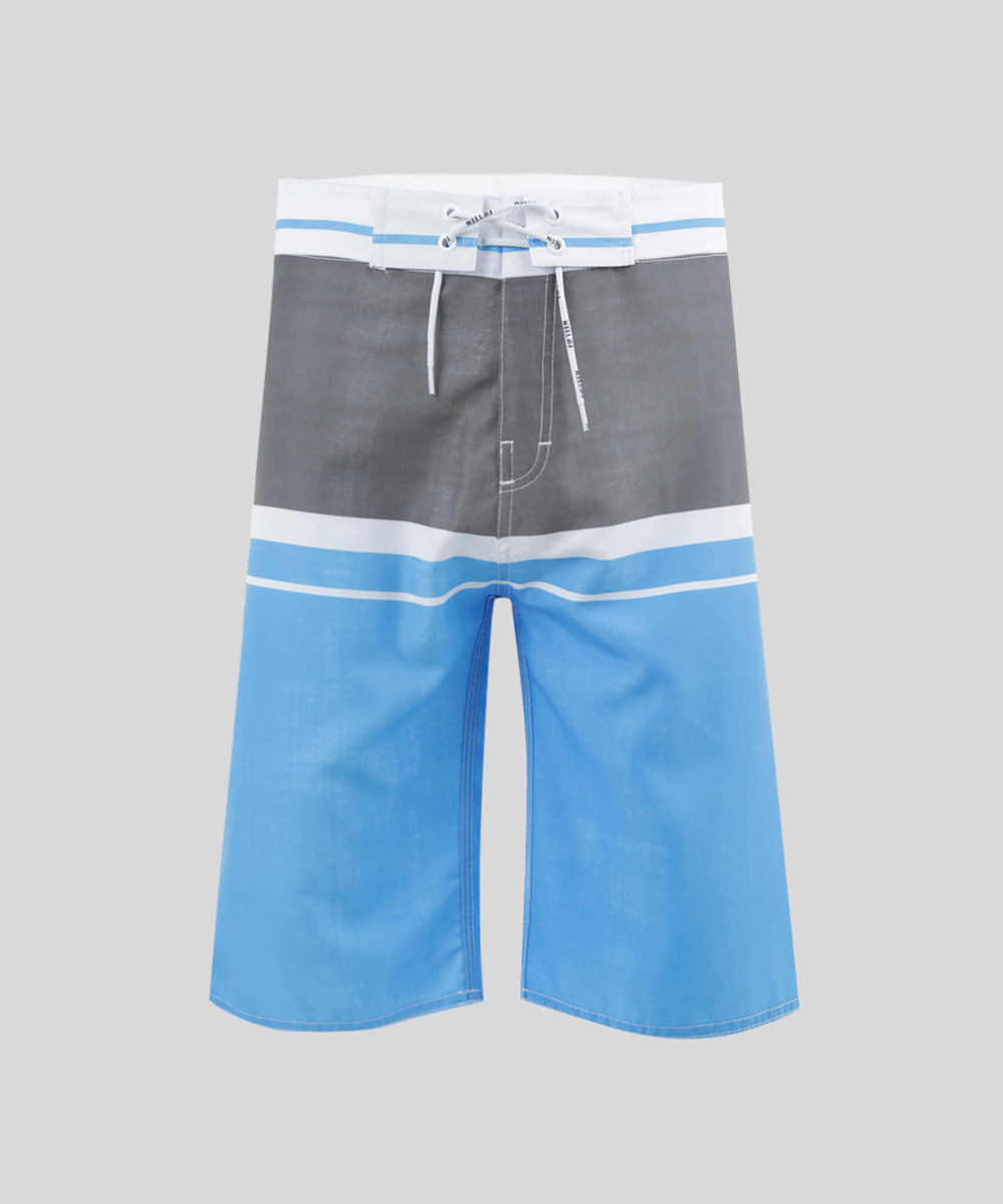 Bermuda confeccionada em tecido plano de secagem rápida. O modelo tem estampa listrada. A parte posterior tem um bolso aplicado. O fechamento é por velcro e amarração.