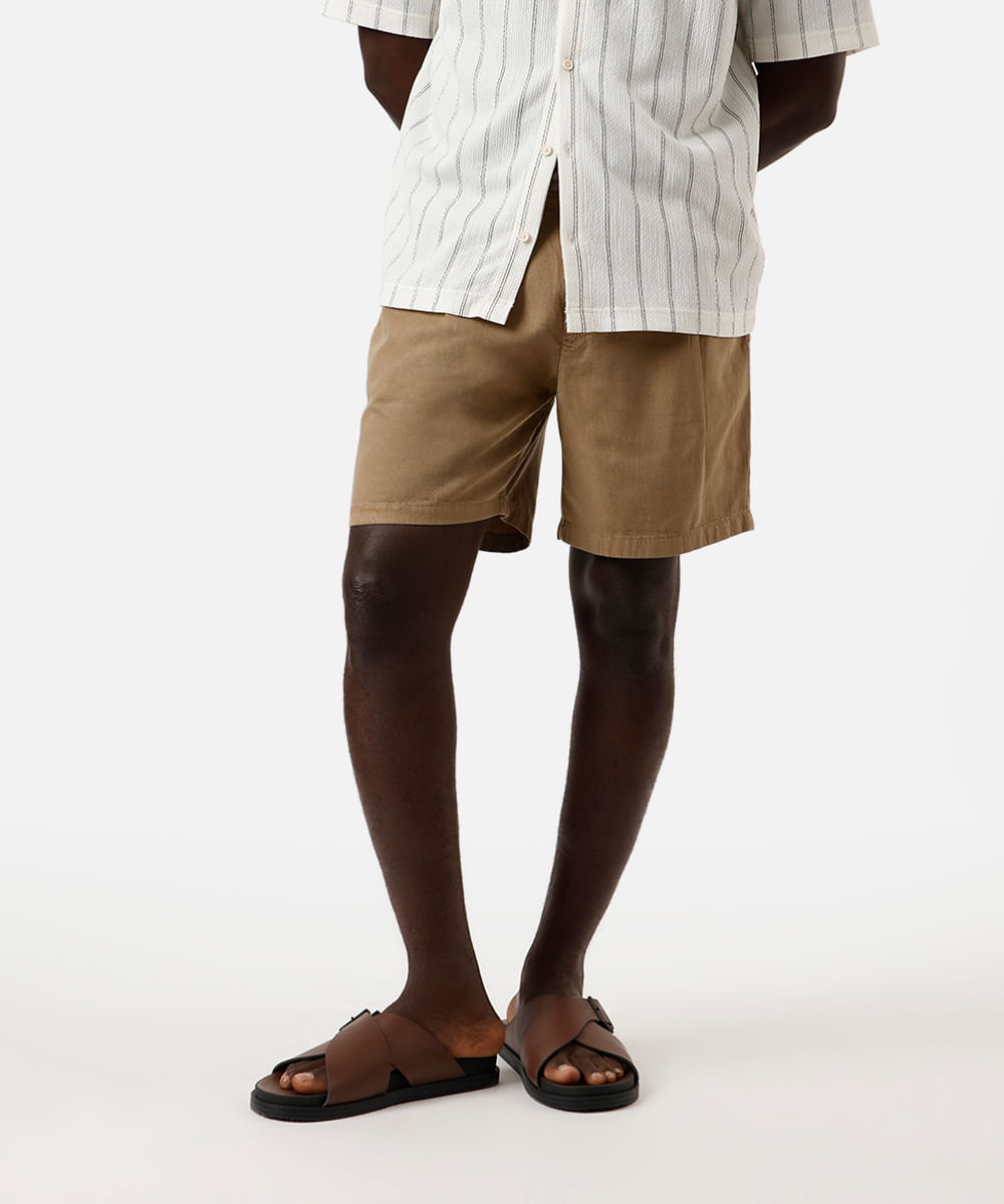 Bermuda masculina confeccionada em material leve com algodão+. A peça possui modelagem reta com caimento solto, cintura média, cós ajustável com cordão para amarração e elástico posterior, dois bolsos laterais e dois bolsos posteriores, sem fechamento e acabamento pespontado.