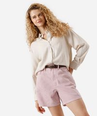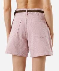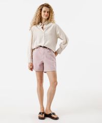 Bermuda feminina confeccionada em sarja estruturada com padronagem listrada. A peça tem modelagem mom, com construção reta e caimento solto ao corpo. O modelo tem cintura alta, cós com passantes para cinto e fechamento por zíper e botão. Possui três bolsos frontais e dois aplicados na parte posterior. Detalhe de acabamento pespontado nas barras. Acompanha cinto em material sintético.
