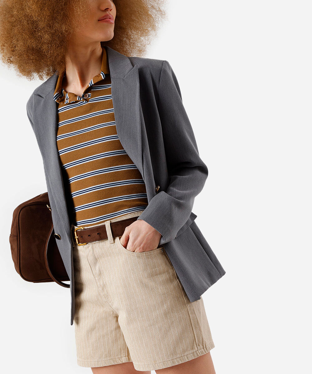 Para um visual casual e moderno, combine esta bermuda de sarja com uma camiseta básica e tênis. Se a ocasião pedir um toque mais arrumado, aposte em uma camisa de botão ou uma blusa polo, adicionando um blazer e um cinto para um look elegante e contemporâneo. Nos pés, sandálias de tiras ou mocassins completam a produção com charme.