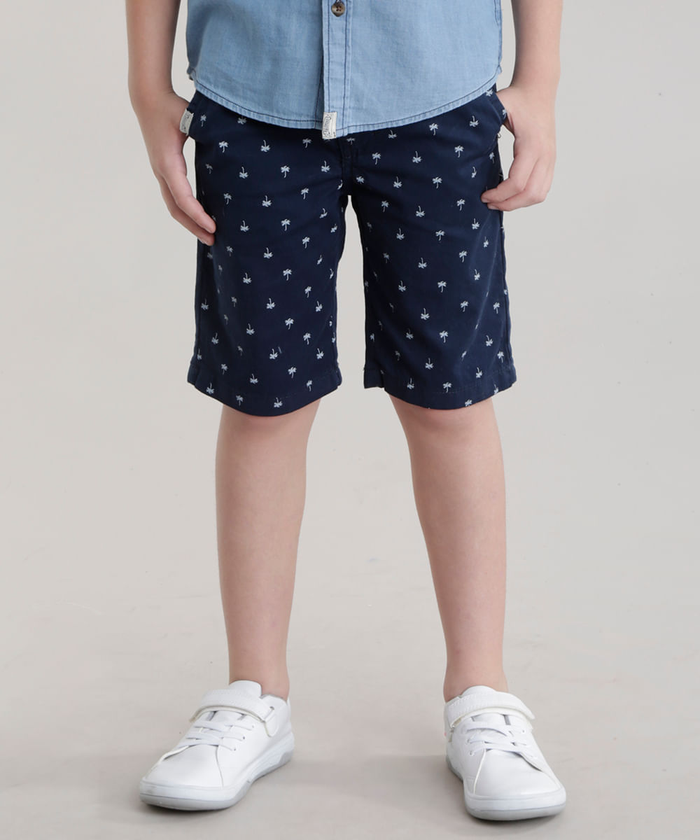 Bermuda confeccionada em sarja com algodão + sustentável, um material que preserva os recursos naturais. O charme da peça é a mini estampa de coqueiros. O modelo conta com dois bolsos faca na parte frontal e dois decorativos na parte posterior. O cós tem ajuste interno por elástico, passantes e fechamento por botão e zíper.