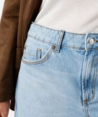 Bermuda feminina confeccionada em jeans estruturado. A peça tem modelagem reta e caimento solto ao corpo. O modelo tem cintura média, cós com passantes para cinto e fechamento por zíper e botão. Possui três bolsos frontais e dois aplicados na parte posterior. Detalhe de acabamento a fio nas barras.