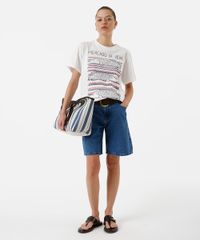 Bermuda feminina confeccionada em jeans estruturado. A peça tem modelagem reta e caimento solto ao corpo. O modelo tem cintura alta, cós com passantes para cinto e fechamento por zíper e botão. Possui três bolsos frontais e dois aplicados na parte posterior. Detalhe de acabamento em pesponto contrastante.