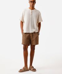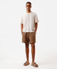 Esta bermuda masculina é extremamente versátil. Para um visual casual e descontraído, combine-a com uma camiseta básica e tênis brancos. Se o destino for a praia, ela funciona perfeitamente como uma roupa masculina de praia, usada sobre a sunga com um chinelo. Para um passeio no fim de tarde, experimente com uma camisa de linho de manga curta e alpargatas para um toque mais arrumado sem perder o conforto.