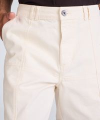 Bermuda masculina confeccionada em sarja toque estruturado. A peça possui modelagem reta com caimento solto, cintura média, cós com passantes aplicados, fechamento por botão e zíper, dois bolsos frontais estilo carpinteiro e dois bolsos posteriores, detalhe de recortes e pequena tag em cor contrastante, acabamento pespontado.
