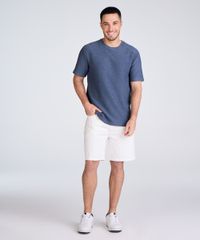 Bermuda masculina confeccionada em sarja com toque macio. A peça possui modelagem reta com caimento levemente solto, cintura média, cós com passantes aplicados, fechamento frontal por botão e zíper, três bolsos frontais e dois bolsos posteriores, acabamento pespontado.