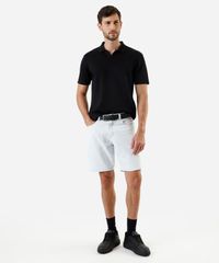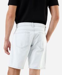 Bermuda masculina confeccionada em jeans. A peça tem a modelagem reta e o caimento é levemente solto ao corpo. O modelo tem cintura média, cós com passantes para cinto e fechamento por botão e zíper. Possui três bolsos na parte frontal e dois aplicados na parte posterior. Detalhe de acabamento pespontado nas barras.
