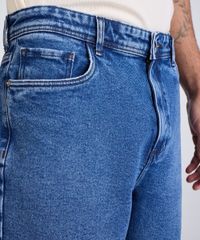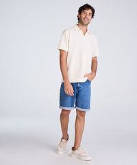 Bermuda masculina confeccionada em jeans. A peça possui modelagem reta com caimento levemente solto, cintura média, cós com passantes aplicados, fechamento frontal por botão e zíper, três bolsos frontais e um bolso posterior, detalhe de dobradura nas barras e acabamento simples.