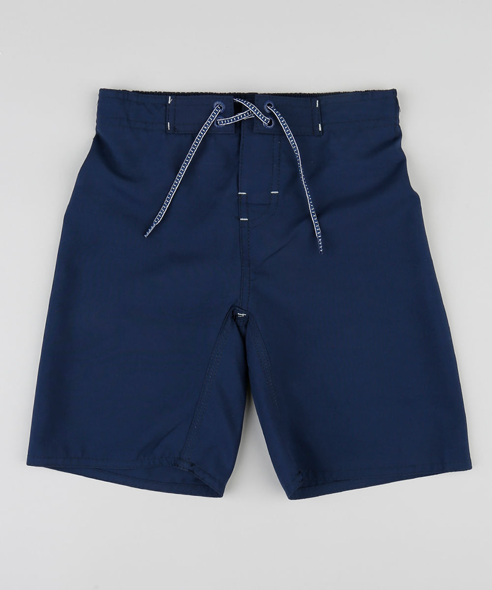 Bermuda infantil confeccionada em tecido plano leve de secagem rápida. A parte posterior tem um bolso aplicado. O cós tem elástico embutido na parte posterior. O fechamento é feito por velcro e amarração.
