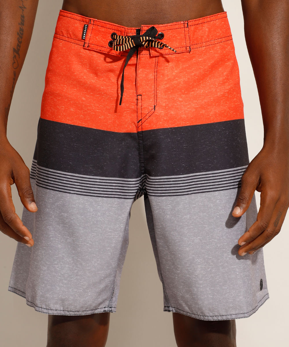 Bermuda masculina confeccionada em tecido plano leve de secagem rápida. Tem estampa com listras de larguras variadas. A parte posterior tem um bolso aplicado com fechamento por velcro. O cós possui fechamento por velcro e cordão de ajuste.