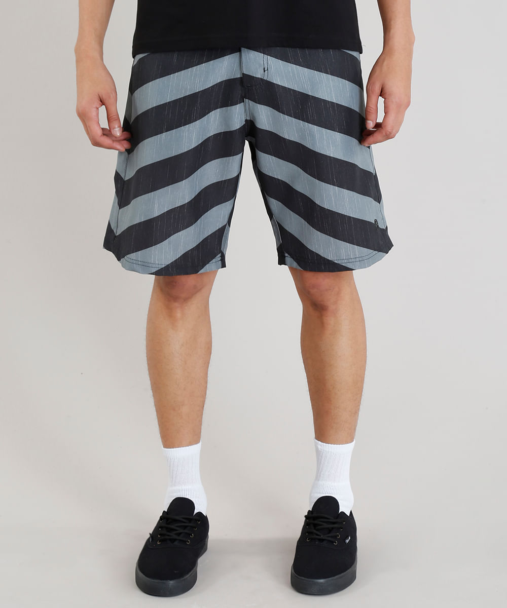 Bermuda masculina confeccionada em tecido plano leve de secagem rápida. A parte frontal têm dois bolsos enquanto a posterior tem um com fechamento por velcro. Tem estampa listrada diferenciada. O fechamento frontal é por botão e zíper.