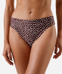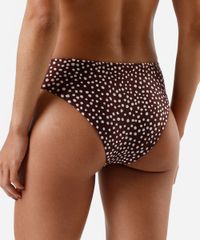 Biquíni calcinha confeccionado em malha com proteção UV e estampa poá. A peça tem modelagem ajustada ao corpo, laterais largas e maior cobertura na parte posterior.